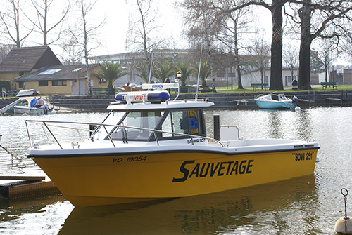 Inauguration d’Osiris II. Il s’agit d’un Saphir 8007 de 8.50 m par 2.52 m, équipé de deux moteurs Volvo Penta V6 de 245 CV chacun. Ce bateau avec cabine est équipé de toute l’instrumentation nécessaire pour effectuer les interventions (radar, GPS, sonar, valise de réanimation O2, motopompe, mât de remorquage amovible, radio SE 156, etc.).